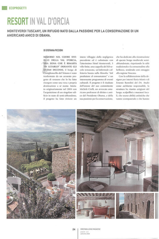 “La struttura ha riunito artigiani del luogo, scalpellini e muratori locali, che usano abilità artistiche che vanno scomparendo e che hanno ridato una nuova vita al Monteverdi, convertendolo in “una seconda casa dove rifugiarsi, per chi è alla ricerca di un tempio dedicato all’intelletto e alla cultura”.”